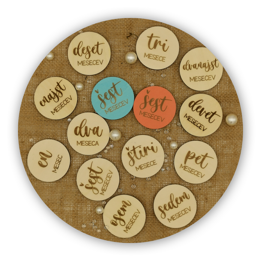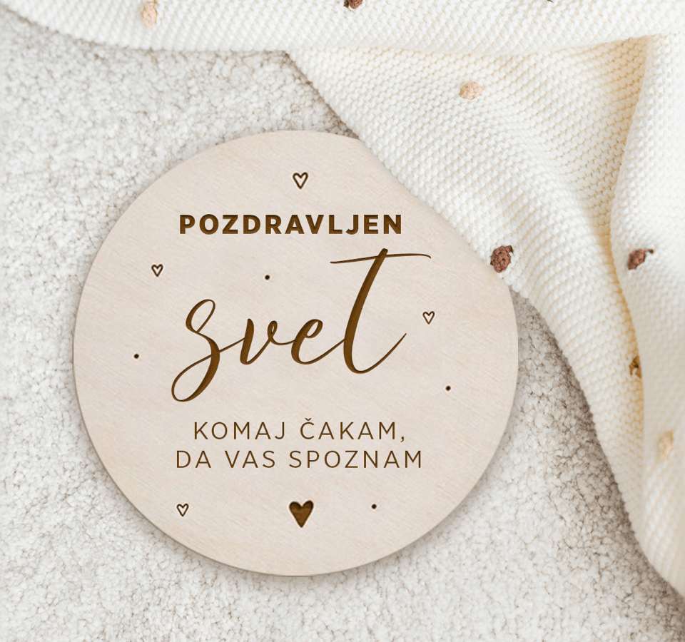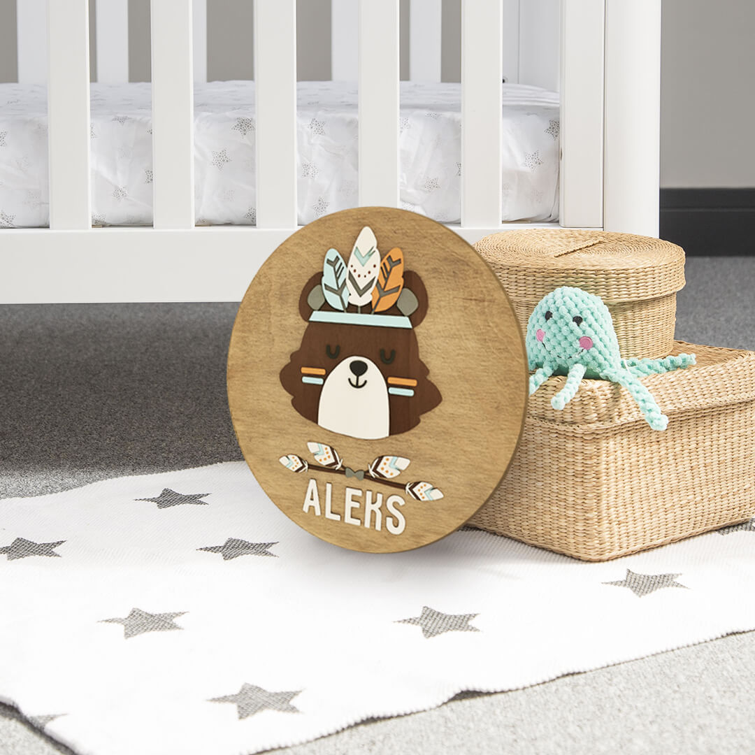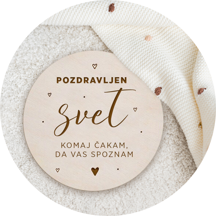 Lesena okrogla otroška tabla z podatki novorojenčka in motivom dinozavrov