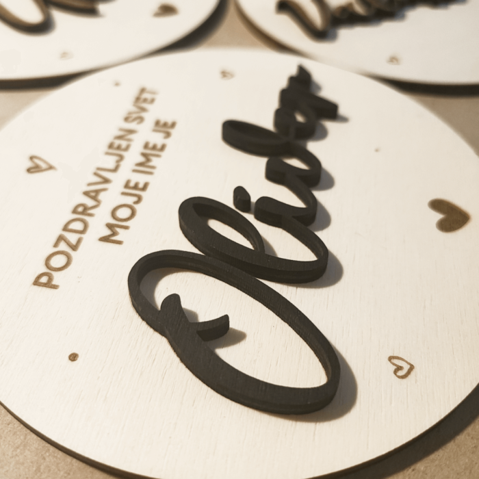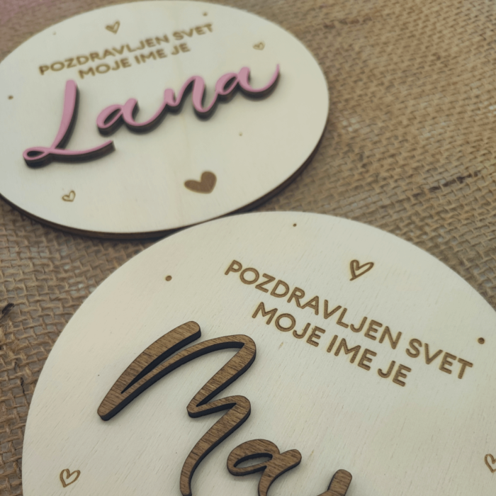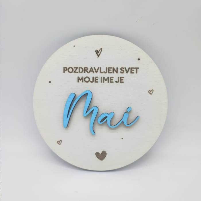 Proslavite prihod svojega malčka s “Pozdravljen svet” leseno kartico z imenom. Kartica je popoln dodatek k fotografiranju vašega novorojenčka. Zaradi modernega, nevtralnega dizajna je lesena ploščica popoln spominek in odličen dodatek za otroško sobo vašega otroka.